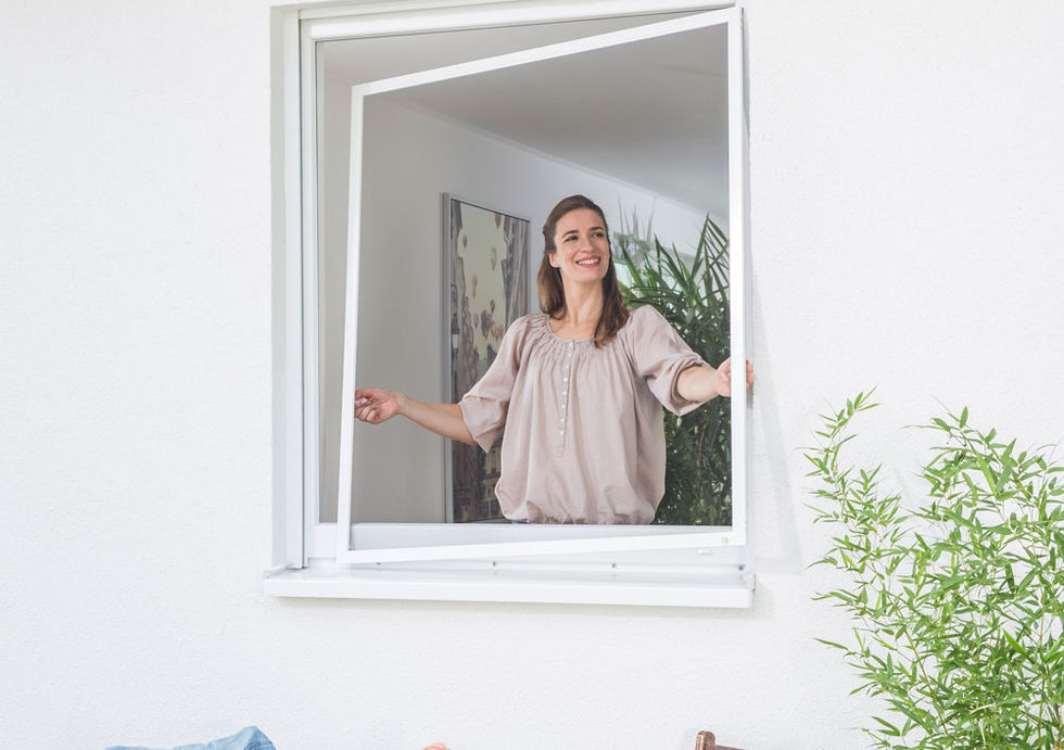 Einbau: Der Spannrahmen lässt sich dank der praktischen Bediengriffe problemlos in den Fensterrahmen einhängen. Für den Fall, dass er nicht gebraucht wird, kann er ebenso einfach wieder entfernt werden.